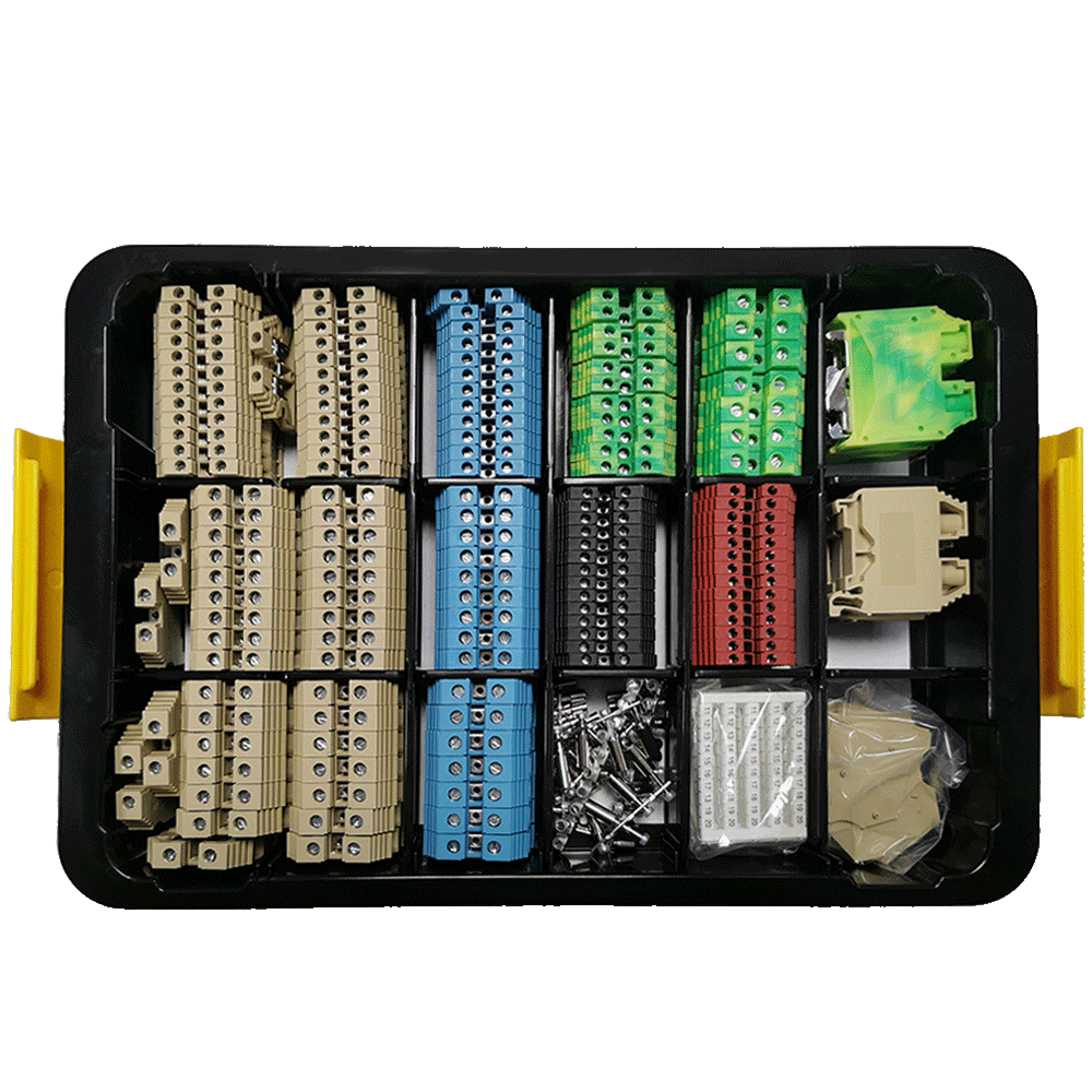 | AST_BO1_1E | 3 x Beige screw clamp terminal 16 mm 16 x beige screw clamp terminal 10 mm 7 x blue screw clamp terminal 10 mm 20 x beige screw clamp terminal 6 mm 9 x Blue screw clamp terminal 6 mm 25 x beige screw clamp terminal 4 mm 12 x blue screw clamp terminal 4 mm 14 x Black screw clamp terminal 2.5 mm 14 x Red screw clamp terminal 2.5 mm 11 x Earth terminal 4 mm 7 x Earth terminal 6 to 10 mm 3 x 16mm Earth terminal 10 x end plate for terminal from 2.5 to 10 mm 2 x Cross-connection 16 mm 4 points 2 x Cross-connection 2.5 mm 10 terminals 2 x Cross-connection 4 mm 10 terminals 2 x Cross-connection 6 mm 10 terminals 50 marking labels 5 mm, marked 1 to 10 50 marking labels 5 mm, marked 11 to 20 50 marking labels 5 mm,- 50 marking labels 5 mm,+ 50 marking labels 5 mm, L1 50 marking labels 5 mm, L2 50 marking labels 5 mm, L3 50 marking labels 5 mm, N |