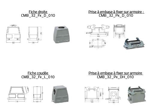 | CMB_32_PM_DH_010 | 4 prises hautes à embase à fixer sur armoire + mâle | ![]() |