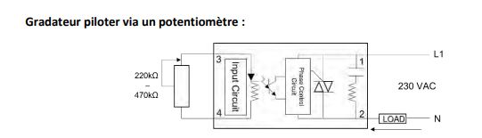 Le gradateur monophasé se comporte comme un contacteur : l'application sur la commande d'un potentiomètre (entre 220 et 470 kΩ) rend le transistor avec une tension variable entre 0 et 230V.